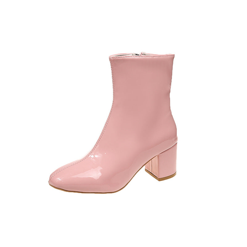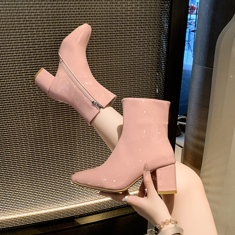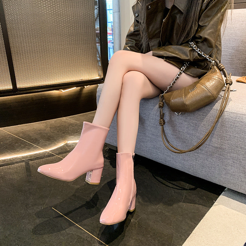 2025 Winter New Korean Version Of High-Heeled Thin Boots Fashion Short Boots Women's Large Size Shoes Bright Leather Side Zipper Coarse HZ0115