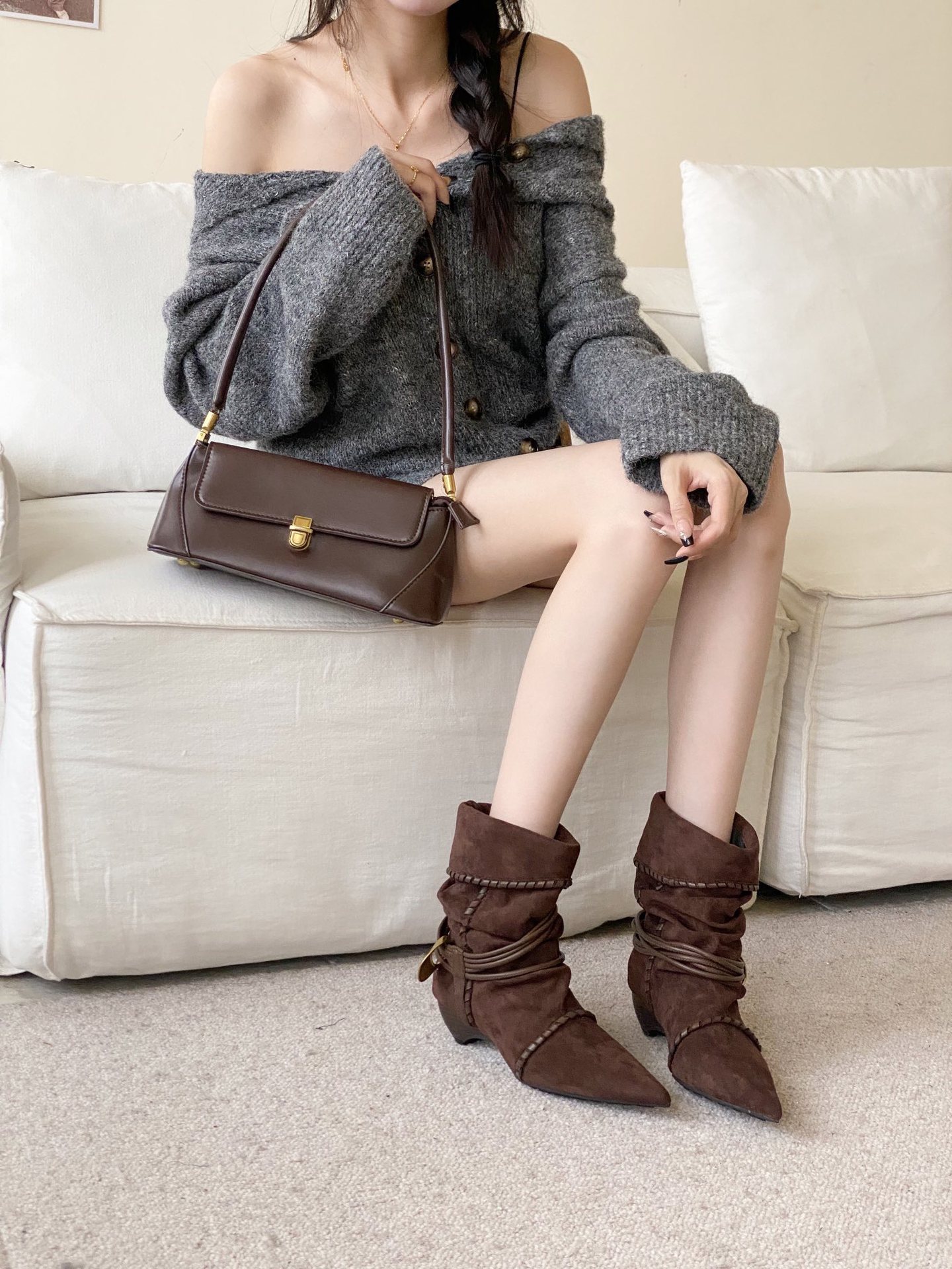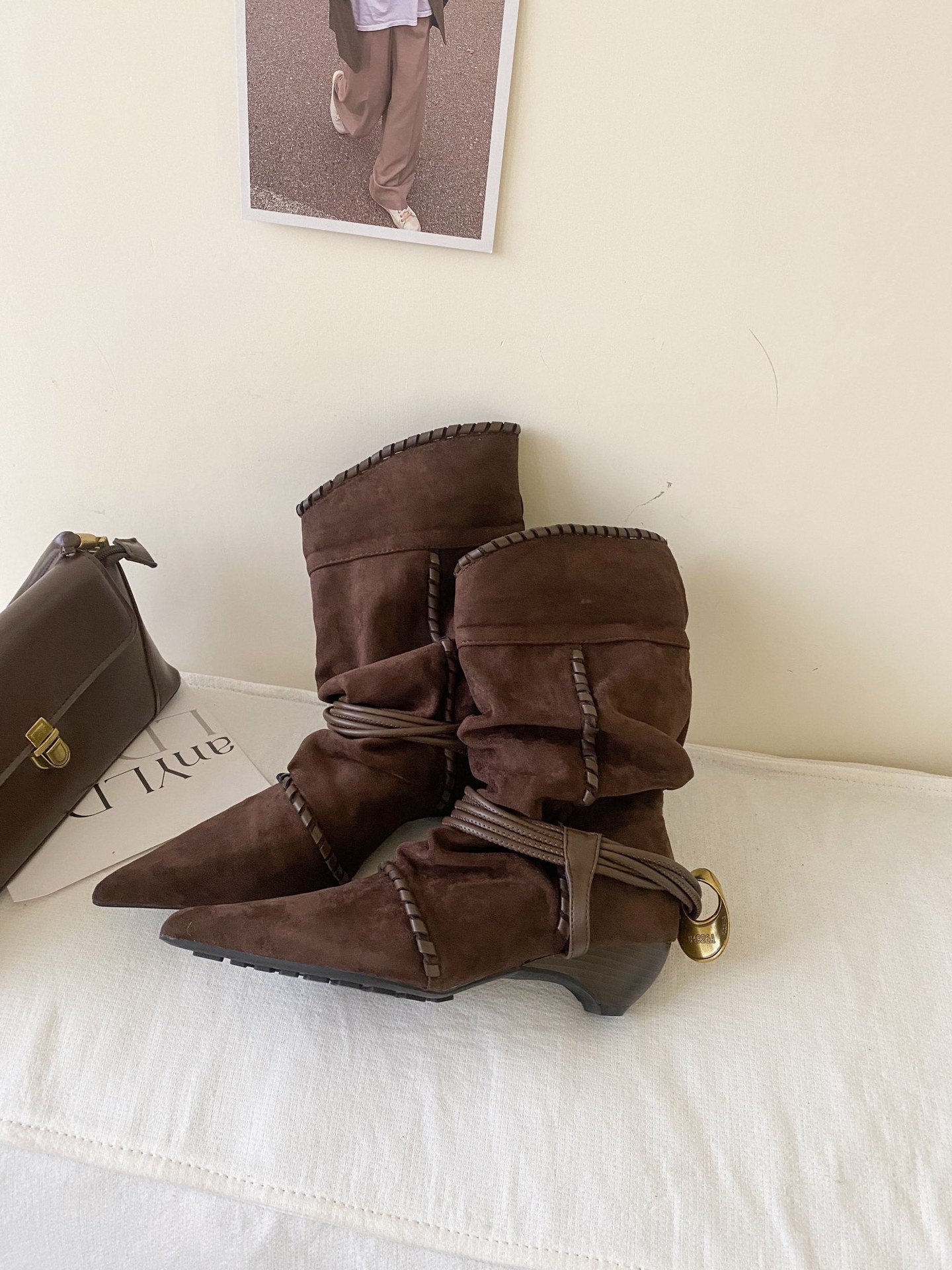 Hand-Stling Metal Buckle Coarse And Pointed Velvet Short Boots HZ0115