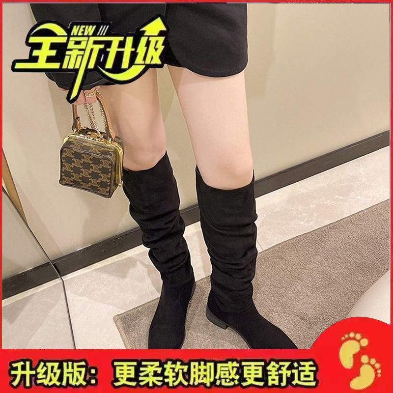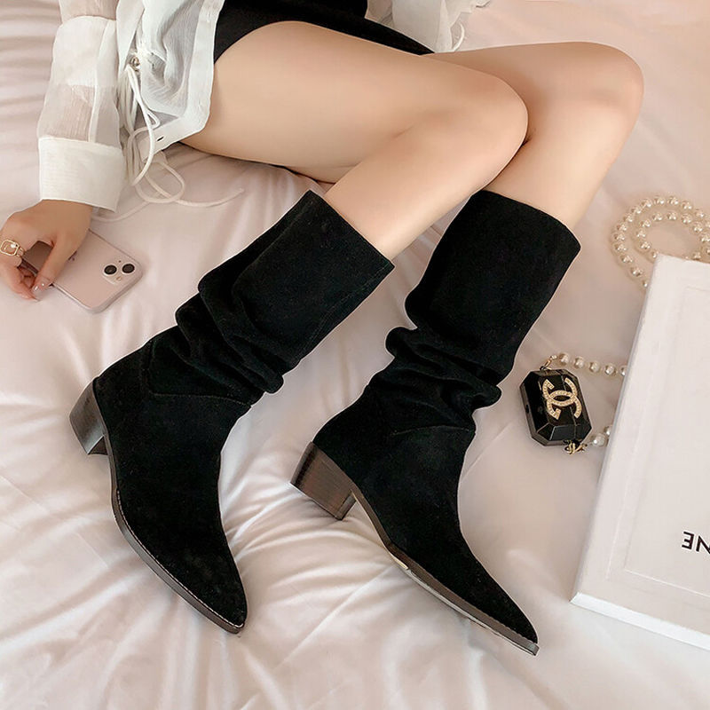 Net Red Pile Folded Long Boots Long Boots Female Western Cowboy Boots Coarse And Retro High-Heeled Knight Boots Around Long Boots HZ0115
