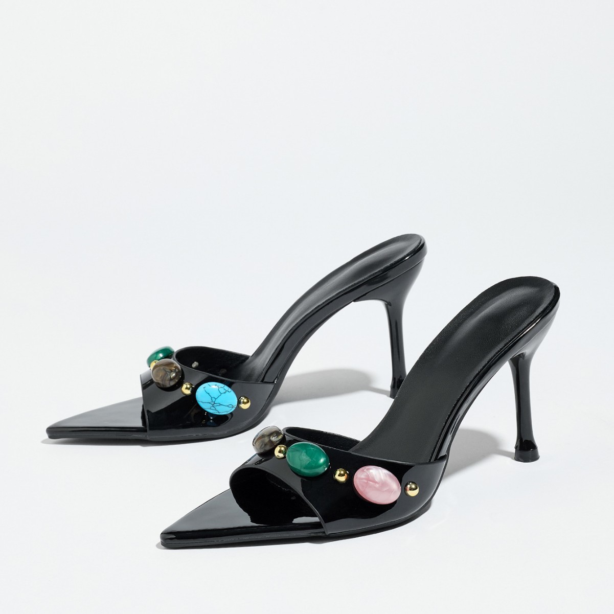 Exploding Point Roman Beads Fine Heel Front Feet Hollow Fashion Black High-Heeled Shoes HZ0115