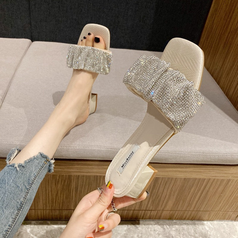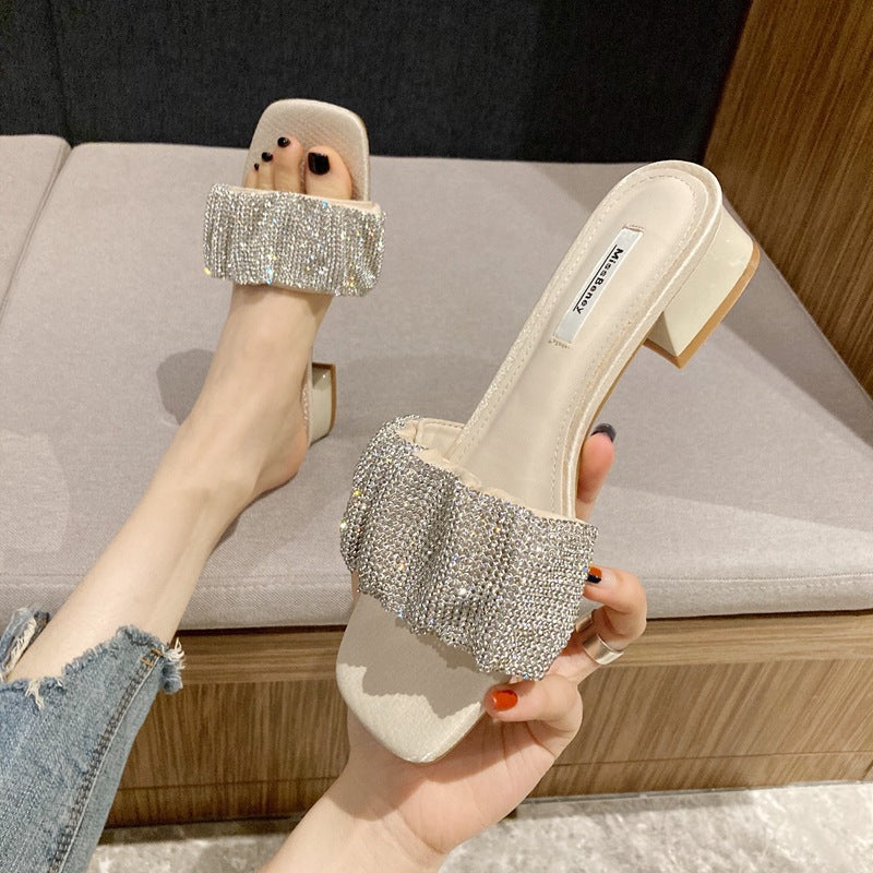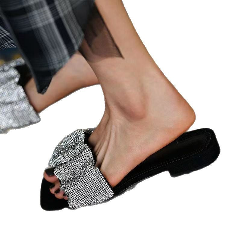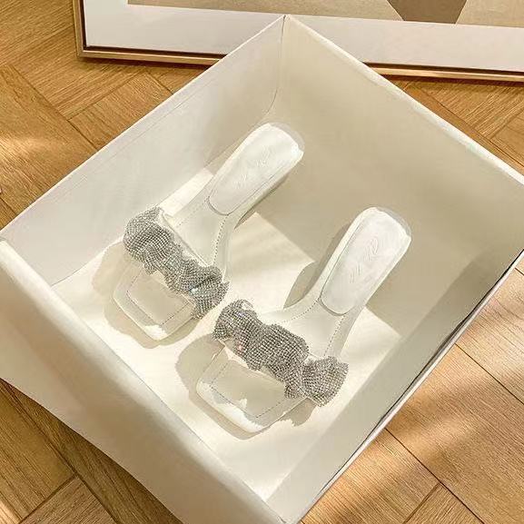 High-Heeled Temperament Famous Woman Summer Slippers French Small Heel Low Heel 3 Cm Black Water Drill Fashion Wearing Sandals HZ0115