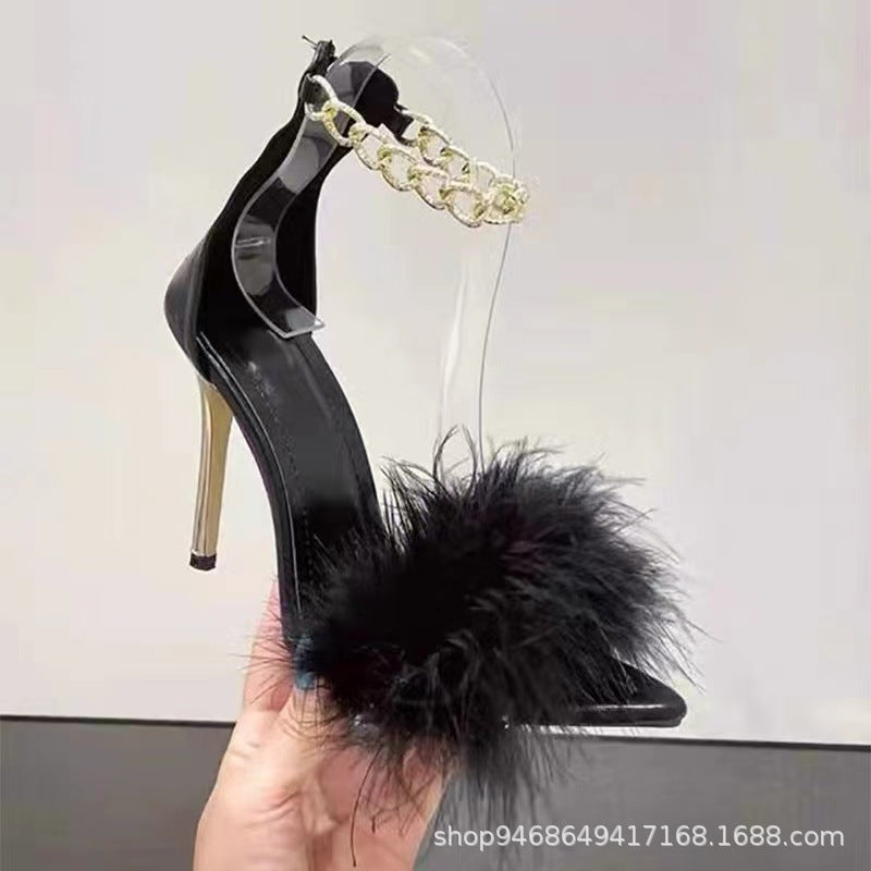 2025 New Summer Temperament High Heels Women Metal Chain Decoration With Fine Heel Fashion Fur Sandals HZ0115