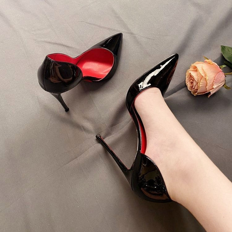 2025 Spring Patent Leather Black Red Bottom Fine Tip High Heels Sexy Niche Temperament 10Cm Side Empty Single Shoe Woman HZ0115
