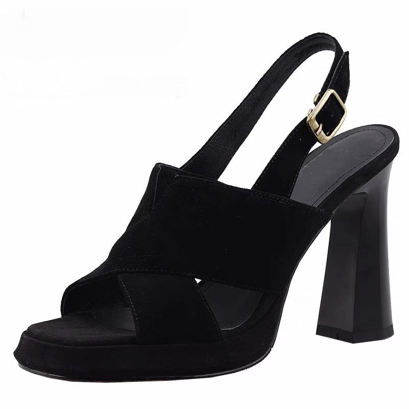 Coarse-Heeled Lady Temperament Sandals 2025 Summer New High-Heeled Frosted Leather Waterproof Toe Black Sandals Women's Shoes HZ0115
