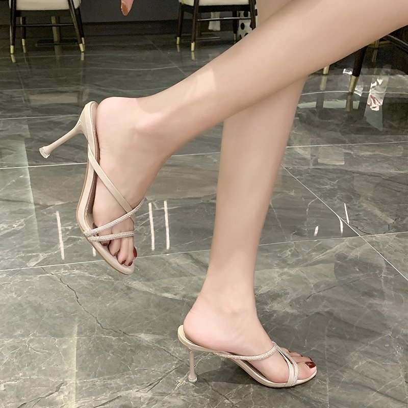 High-Heeled Sandals Water Drill Women's Fine And Exposed Toe 2025 Summer New One-Word With Half-Slippers Wearing Net Red Tide HZ0115