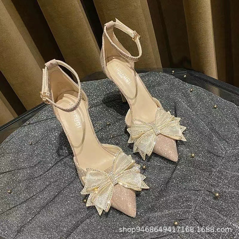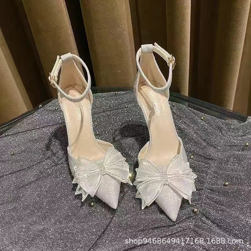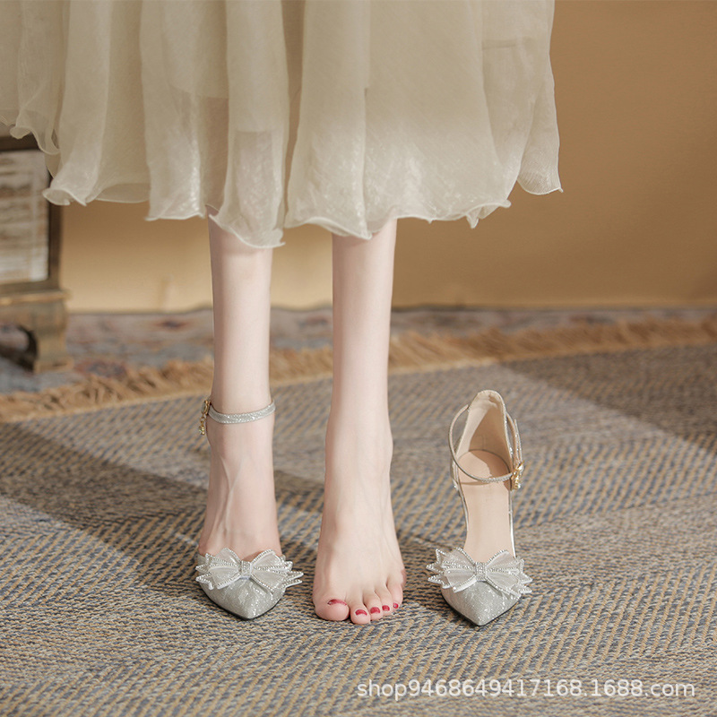 Sandals Women's Summer 2025 New Baotou Hollow Bow High Heels Fairy Pointed Shoes Princess Wind Dress Shoes HZ0115