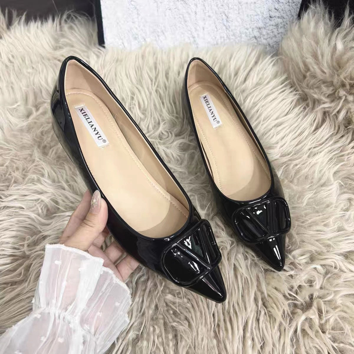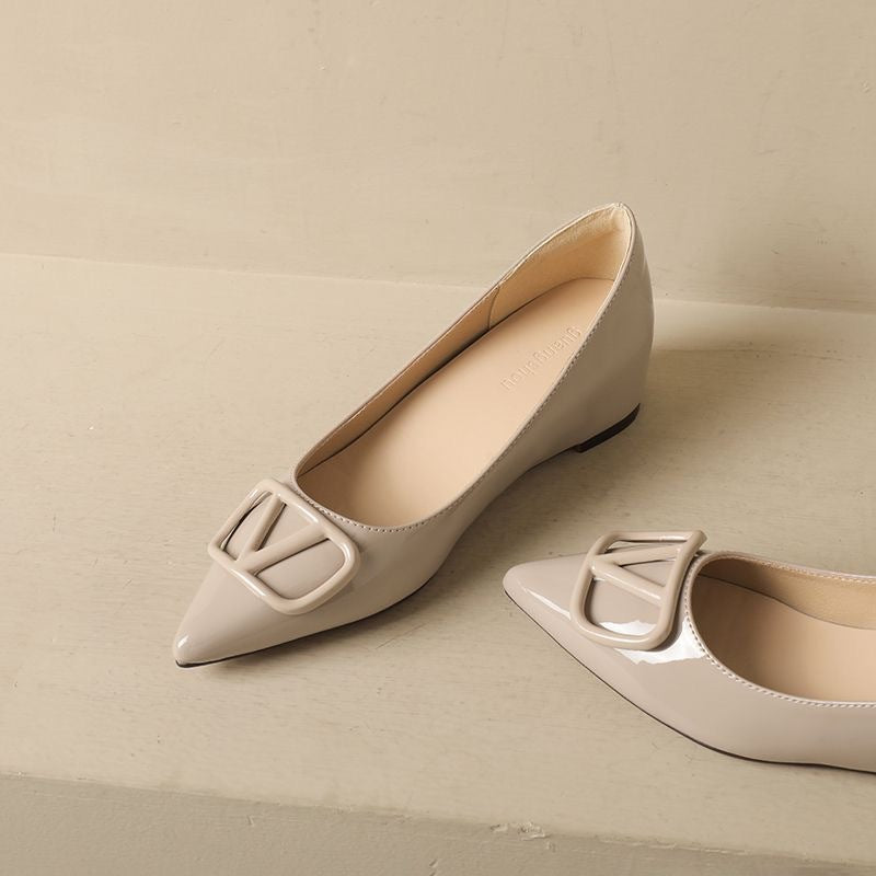 Small Sharp Head Soft Soles In The Increase Single Shoes Spring And Autumn Leather Bare Light Flat Commuting V Buckle Temperament Women's Shoes HZ0115