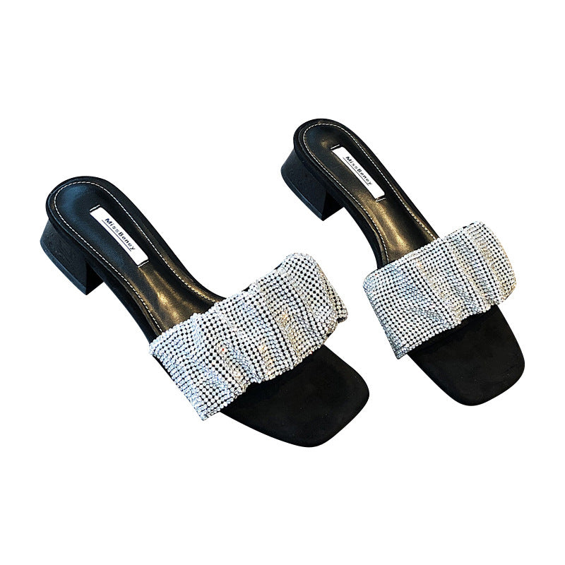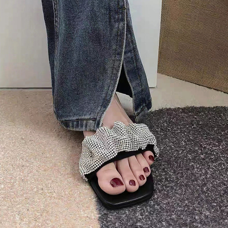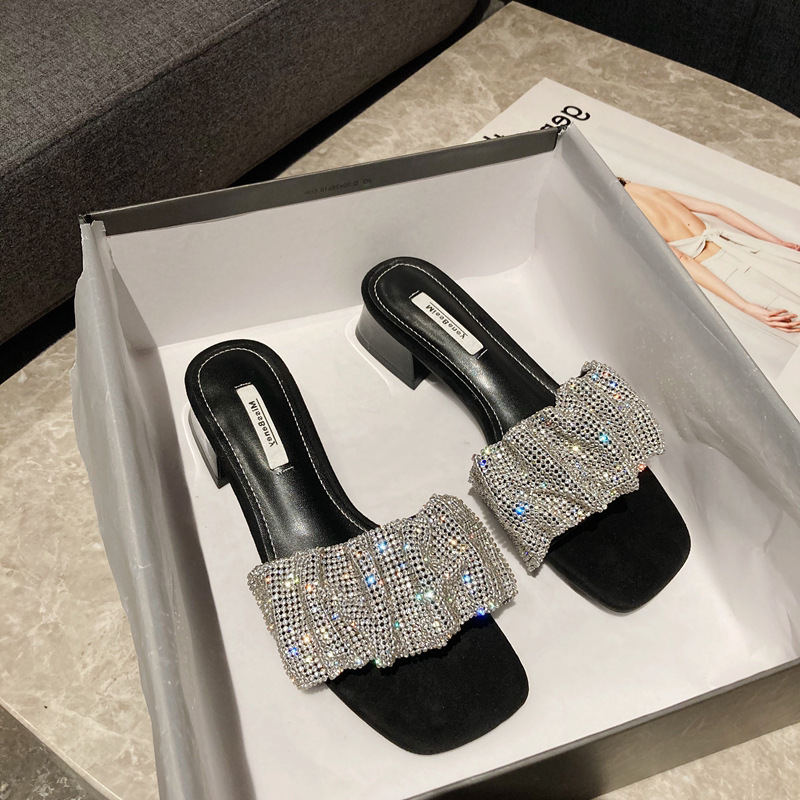 Summer Slippers Women's Fashion Wearing Fairy Wind 2025 New Water Drill Cool Drag Low And Exposed Toe Coarse And Word Drag HZ0115
