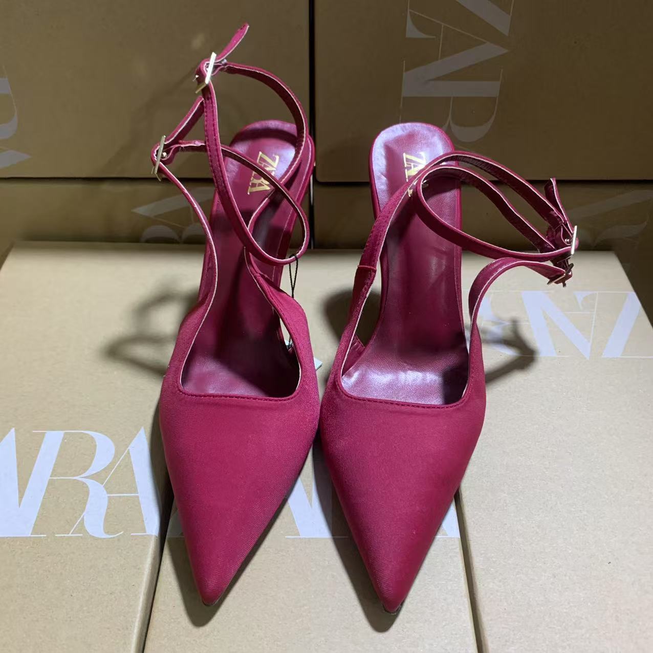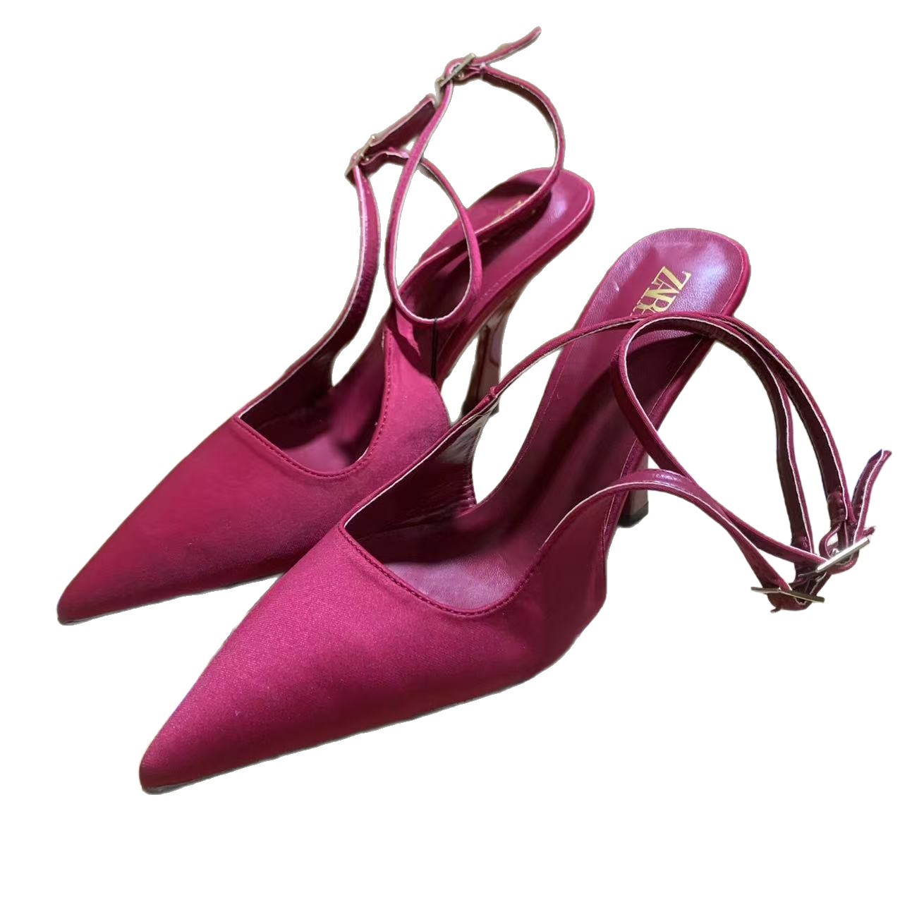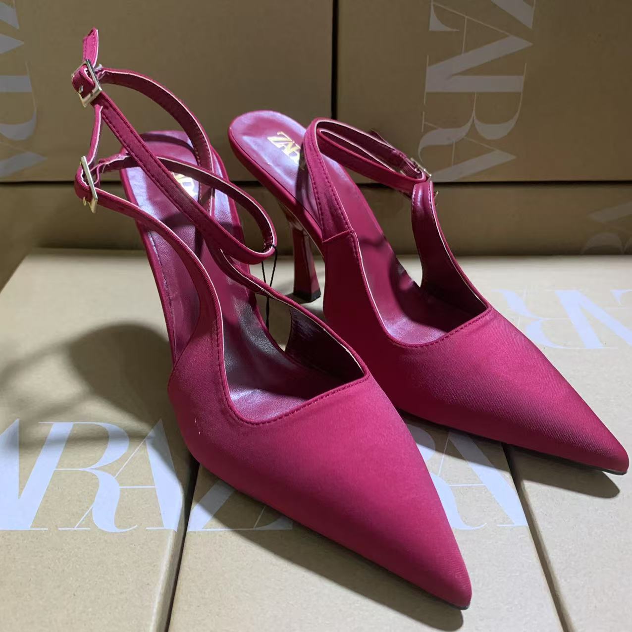 ZA Home 2025 New Women's Shoes Low Heel Temperament High Heels High-Heeled Shoes Behind The Shallow Mouth Triptling Single Shoes Rose Red HZ0115