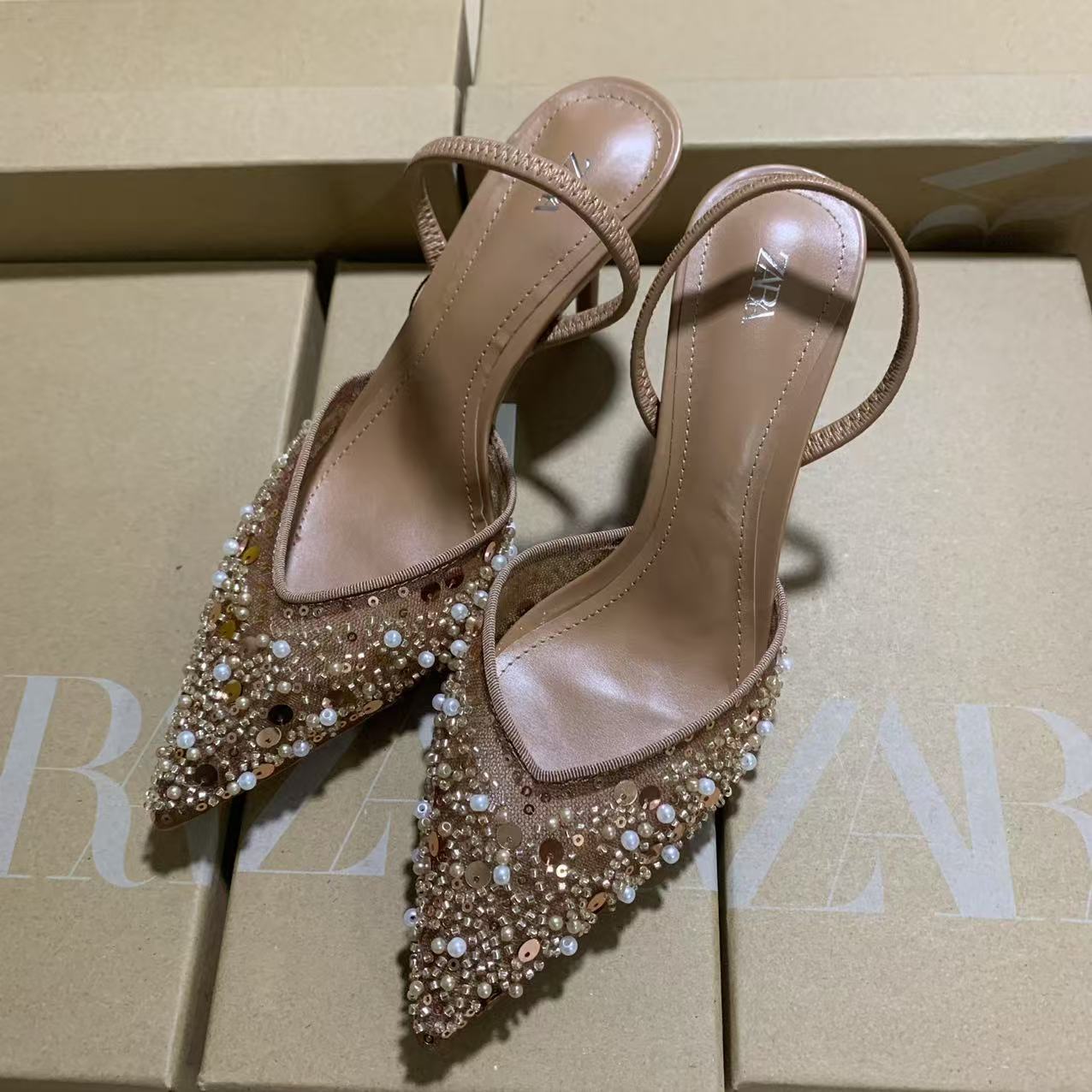 ZA2025 Spring New Women's Shoes Apricot Beads And Set Mesh With Sharp Tips High Heels HZ0115